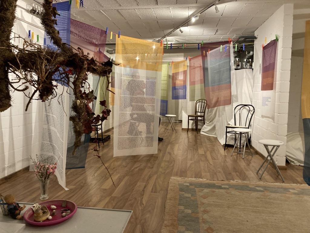 Aus den Geschichten entstand eine Ausstellung: Texte, auf transparente Stoffbahnen gebrannt – und trotz aller Vergänglichkeit festgehalten. Die Verwendung von Stoff symbolisiert nicht nur Wärme und Behaglichkeit, die mit dem Zuhause verbunden sein können, sondern dient auch als Metapher dafür, wie Geschichten und Erinnerungen in das Gewebe unserer Identität eingewebt sind. So wie man diese Stoffe zwar durchsehen, aber nicht vollständig erfassen kann, so sind auch Erinnerungen sichtbar und einflussreich, aber dennoch schwer fassbar.